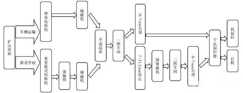 神山矿石加工生产线的干法工艺流程如图2所示,该流程中将所有7mm以内的石屑都经过干法制砂楼处理成机制砂和石粉,干法制砂楼是制砂核心设备。